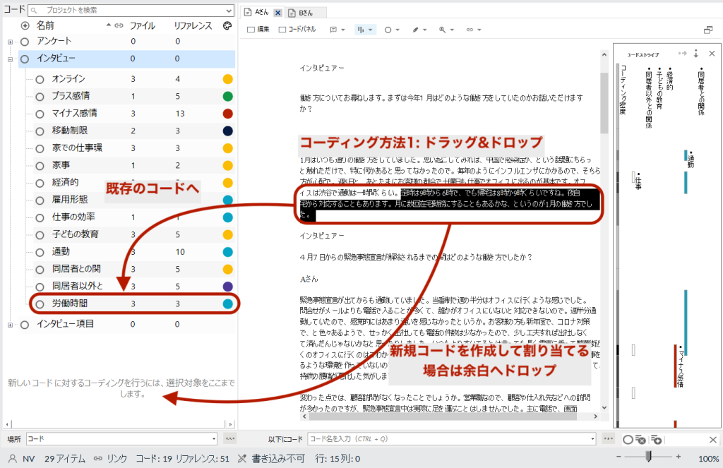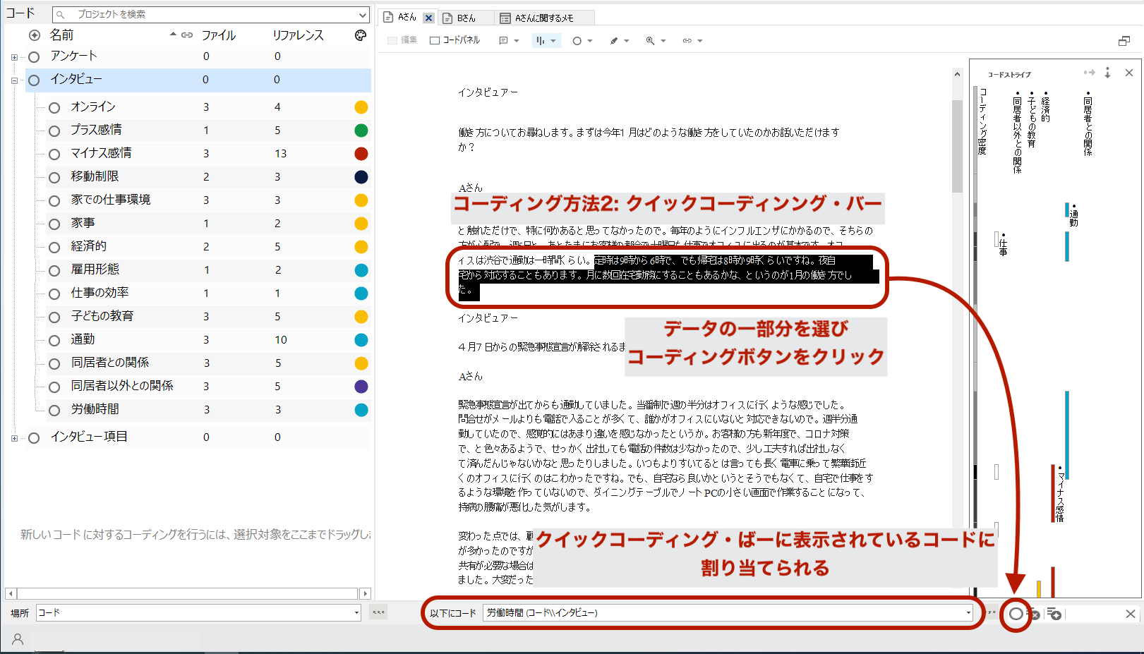 コードをダブルクリックするとリファレンス(コードを割り当てたデータの一部分)を表示できます。これは元のファイルにリンクしていますので、元ファイルに戻り前後の文脈を確認したりできます。コードを開いた上でさらにコーディングも可能(コード・オン)ですので、インタビューで大きなテーマごとのコードにまず整理しておき、そのコードを開いて内容を細分化していく場合などに便利です。