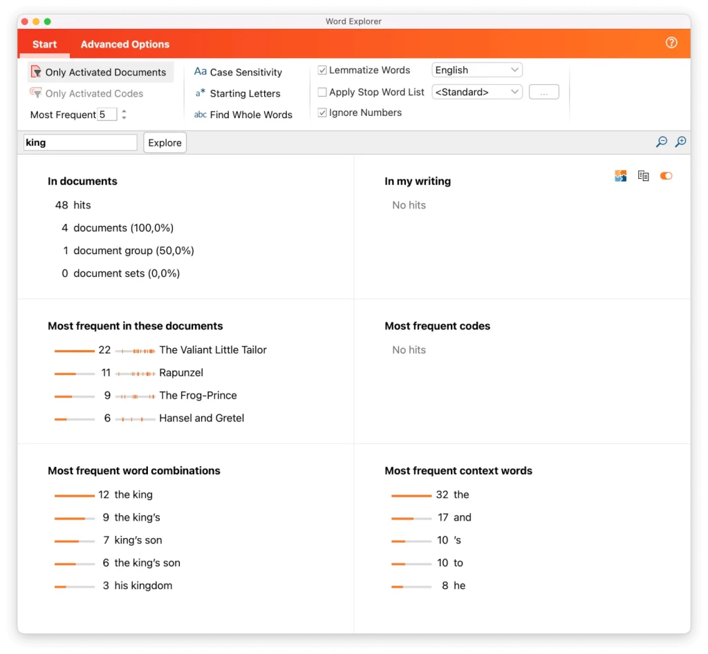 単語の組合せの分析の結果は、デフォルトでは頻度(降順)で並べられた表として表示されます。一度に複数の文書の語句の組合せを分析する場合、文書ごとに結果を区別することができます。この場合、結果の表は、文書ごとにそれぞれの頻度を含む個別の列で構成されます。列のヘッダー(文書名)をクリックすると、そのおとぎ話における頻度に従って、単語の組合せを並べることができます。単語の組合せの列のエントリをダブルクリックすると、クリックした単語の組合せのすべての出現回数、文脈、およびテキスト内の位置を含むリストが表示されます。単語組合せツールは、多くの場合単語組合せ分析の出発点となります。なぜなら、概要表により、詳しく調べる価値のあるキーワードや単語の組合せを特定するなど、最初の推論をすばやく行うことができるからです。