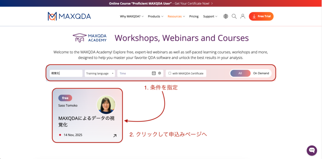 1. 主催者(VERBI GmbH)のウェブサイトMAQDA Academy – Workshops, Webinars and Coursesへアクセス